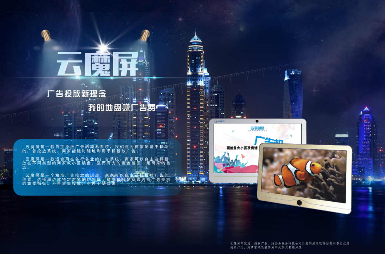 易城易云魔屏+是互聯(lián)網(wǎng)+傳媒+智能硬件與軟件的科技。專注打造“互動媒體+廣告”的新媒體平臺,以做為應(yīng)用場景,增加商家的宣傳價(jià)值、開創(chuàng)互聯(lián)網(wǎng)互動媒體新局面。